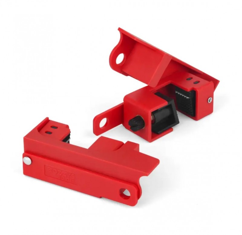 Блокиратор широких автоматических выключателей типа Grip Tight BD-D18-1, подходит для большинства типов электроавтоматов большого размера. Фиксация происходит за счет рифленных зажимов из пластика, регулируемых колесиком с накаткой. Подходит для навешивания одного замка, с диаметром дужки не более 7,5 мм.