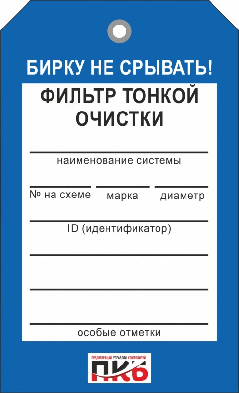 Информационная бирка "Фильтр тонкой очистки". Изготовлена из пластика ПВХ, толщиной 0,3 мм, без ламинации, диаметр отверстия 7 мм. По желанию заказчика толщина бирки может быть увеличена до 1-2 мм. Нанесение текста необходимо производить маркером или шариковой ручкой. Размер 70 х 115 х 0,3 мм.