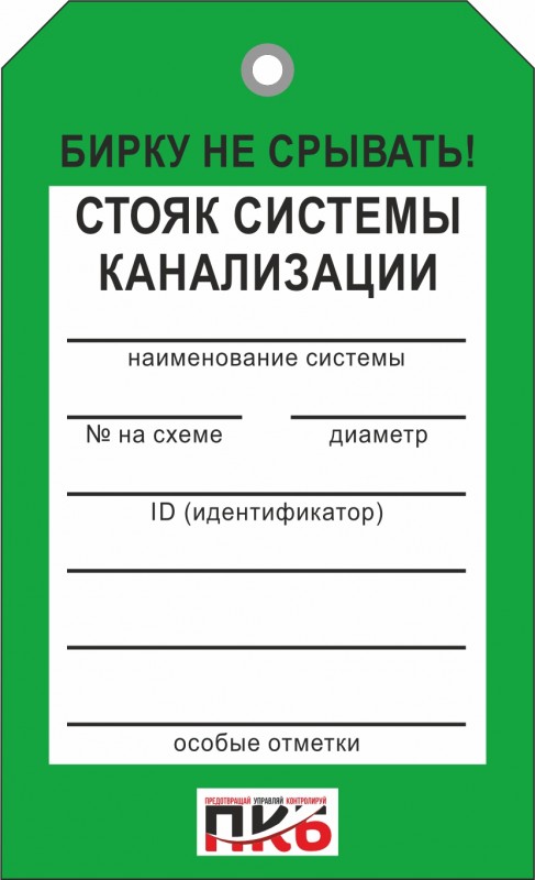 Информационная бирка "Стояк системы канализации". Изготовлена из пластика ПВХ, толщиной 0,3 мм, без ламинации, диаметр отверстия 7 мм. По желанию заказчика толщина бирки может быть увеличена до 1-2 мм. Нанесение текста необходимо производить маркером или шариковой ручкой. Размер 70 х 115 х 0,3 мм.