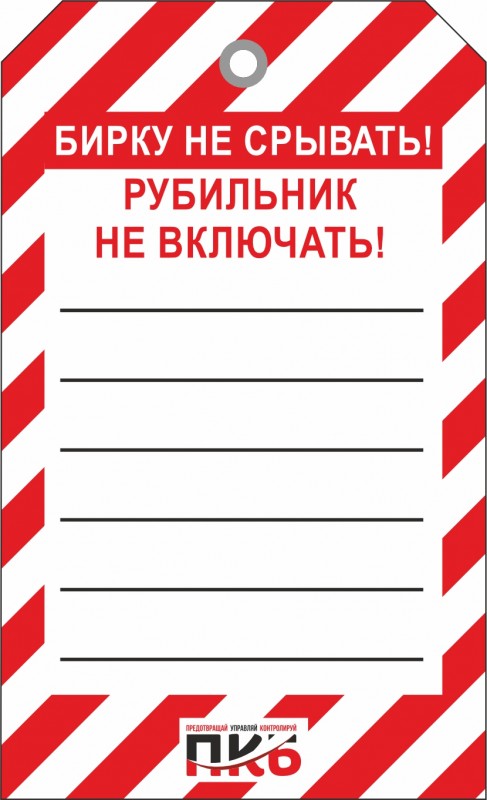 Информационная бирка "Рубильник не включать", арт. PKBS102, для одноразового использования, односторонняя. Изготовлена из пластика, толщиной 0,3 мм, оснащена металлическим люверсом Ø 8 мм . По желании заказчика толщина бирки может быть увеличена до 1-2 мм. Нанесение текста можно производить маркером или ручкой. Размер 70 х 115 х 0,3мм.